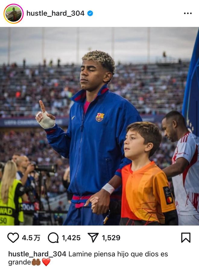 本场比赛亚马尔表现一般,赛后评分仅6.4分。亚马尔的父亲先是晒出了亚马尔的入场照片并为此配文:“拉明此刻心想,上帝是最伟大的。”